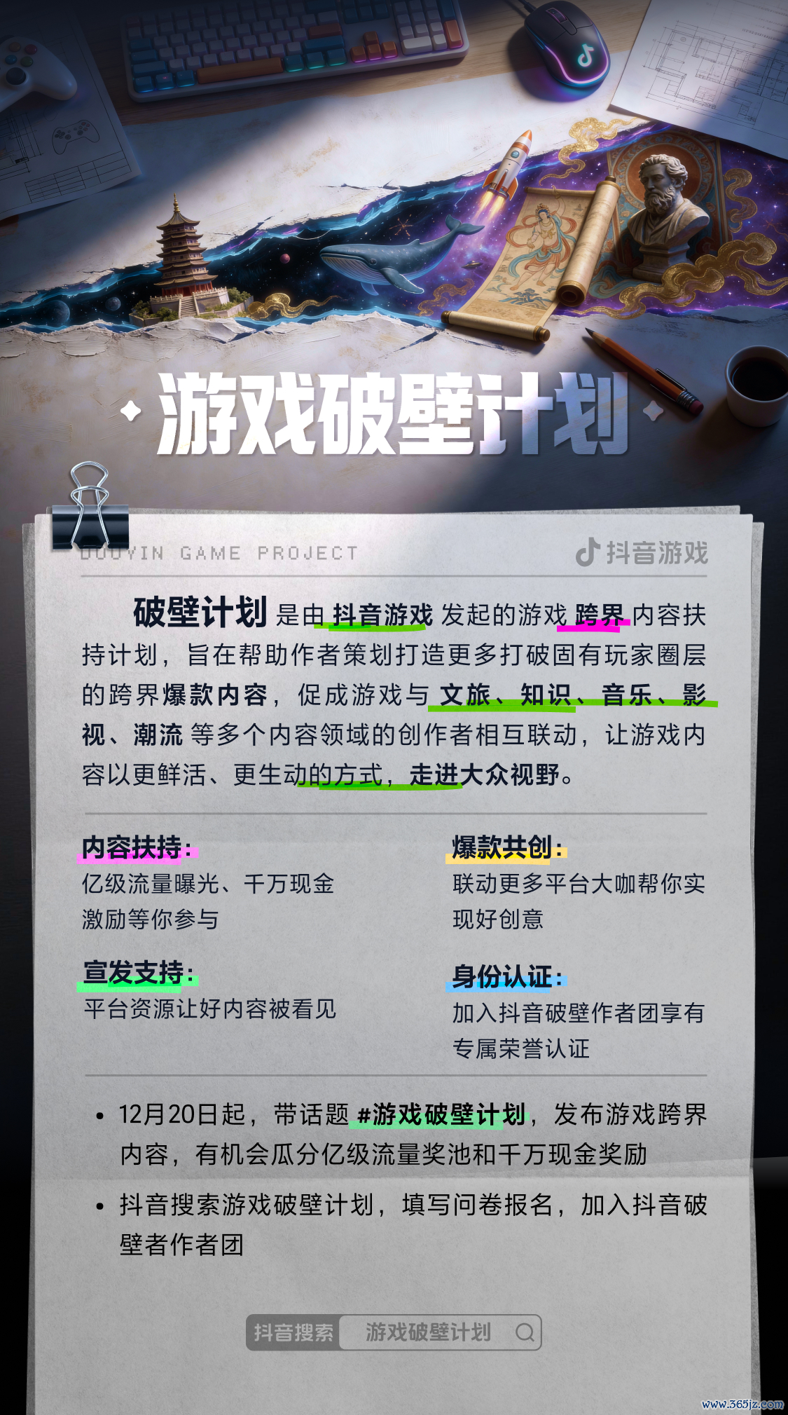12月20日起,创作家带话题“游戏破壁方针”,发布游戏跨界本色,即可参与活动。创作家还可抖音搜索“游戏破壁方针”,填写问卷报名,加入抖音破壁者作家团,取得专属荣誉认证。抖音将对作家团成员提供流量、现款、平台资源等多重激励,并复古创作家干涉共创活动,与更多游戏达东谈主联动打造爆款本色。